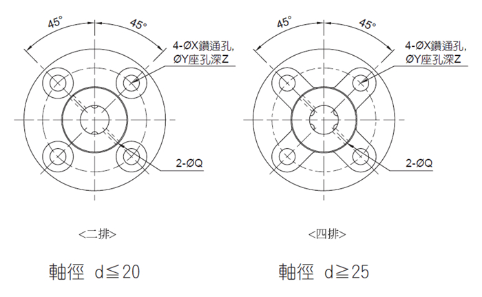 利用法蘭通過螺全都固定在支撐座上,因為裝配簡單,最實用在加工鍵槽有變形的危險或是支撐座的寬度比較狹小的場合,能完全地防止配合部分產生旋轉方向間隙
