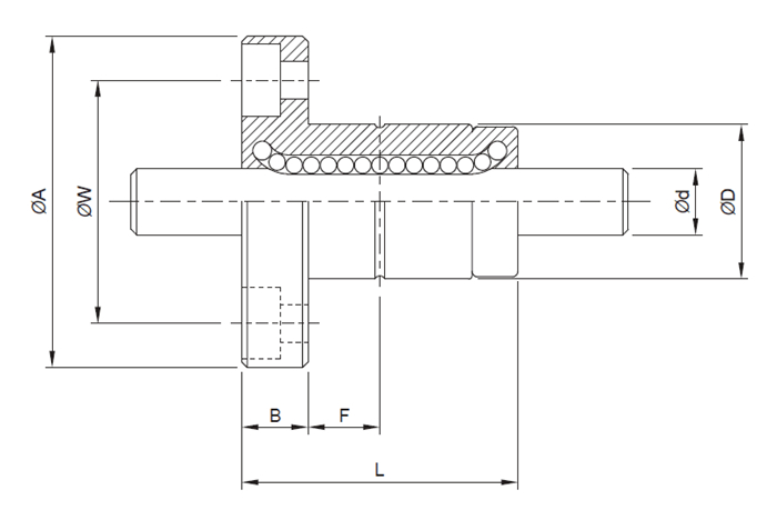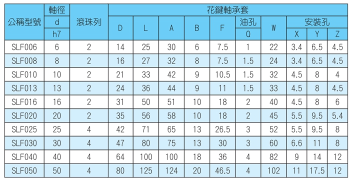 下圖是TBI滾珠花鍵SLF系列的實心斷面形狀,花鍵軸端為法蘭型,在坑能的情況下可以超過溝槽直徑(∅d),SLF系列花鍵通過對花鍵的滾動溝槽進行精密研磨,連到高精度而后與外筒配合