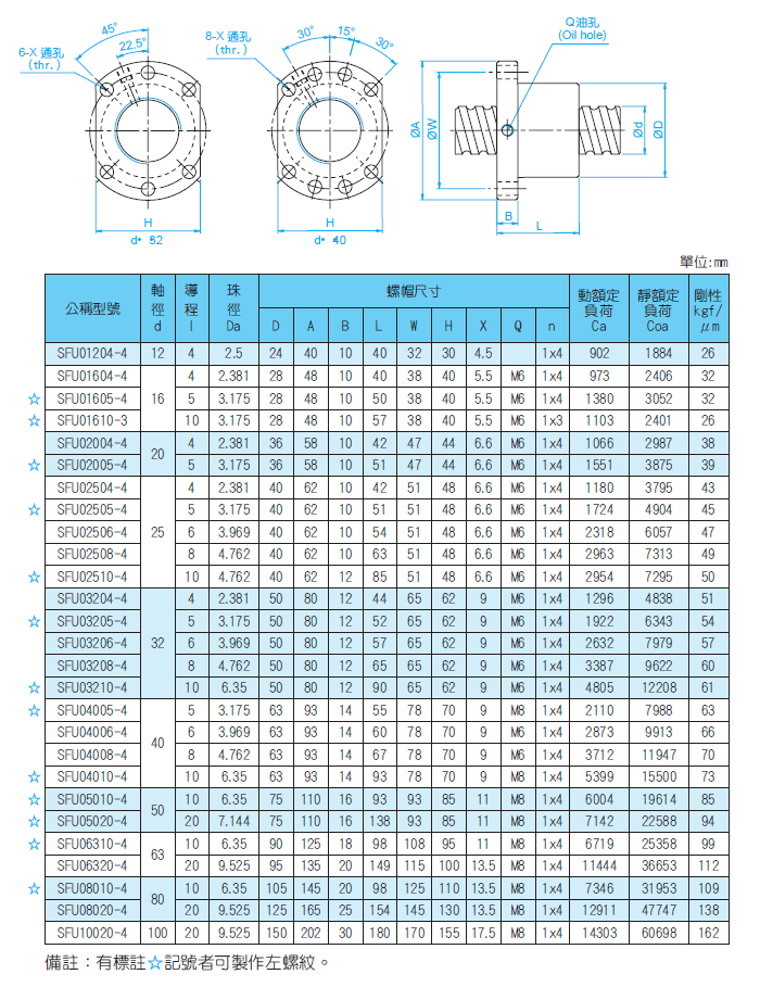 SFUR1204 SFUR1604 SFUR1605 SFUR1610 SFUR2005 SFUR2505 SFUR2510 SFUR3205 SFUR3210 SFUR4005 SFUR4010 SFUR5010 SFUR5020 SFUR6310 SFUR6320 SFUR8010 SFUR8020 SFUR10020